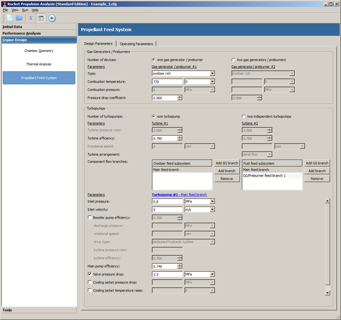 - Operational parameters of combustion devices (gas generators or preburners): pressure, mass flow rate and mixture ratio