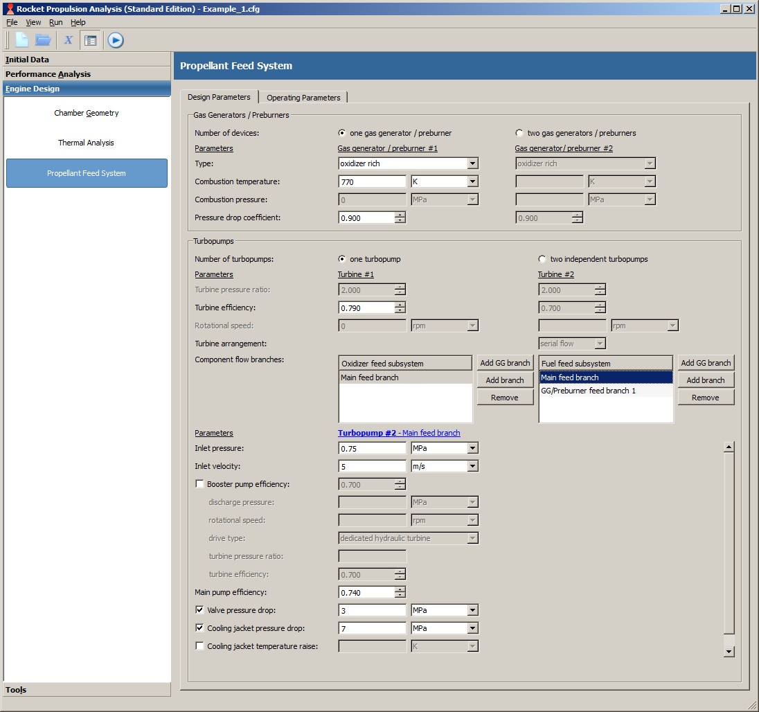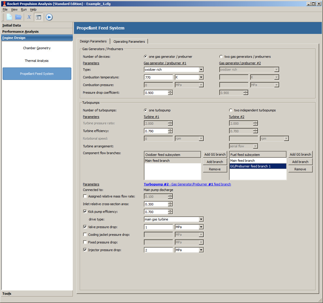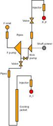 | Kick pump | Efficiency | 0.3...0.5 | If no kick pump is defined, the pump of the main branch has to produces such a discharge pressure that it fits to inlet of gas generator/preburner. Usually no kick pump is required for gas generator cycle, whereas an absence of kick pump in staged combustion cycle leads to significant pressure raise. |